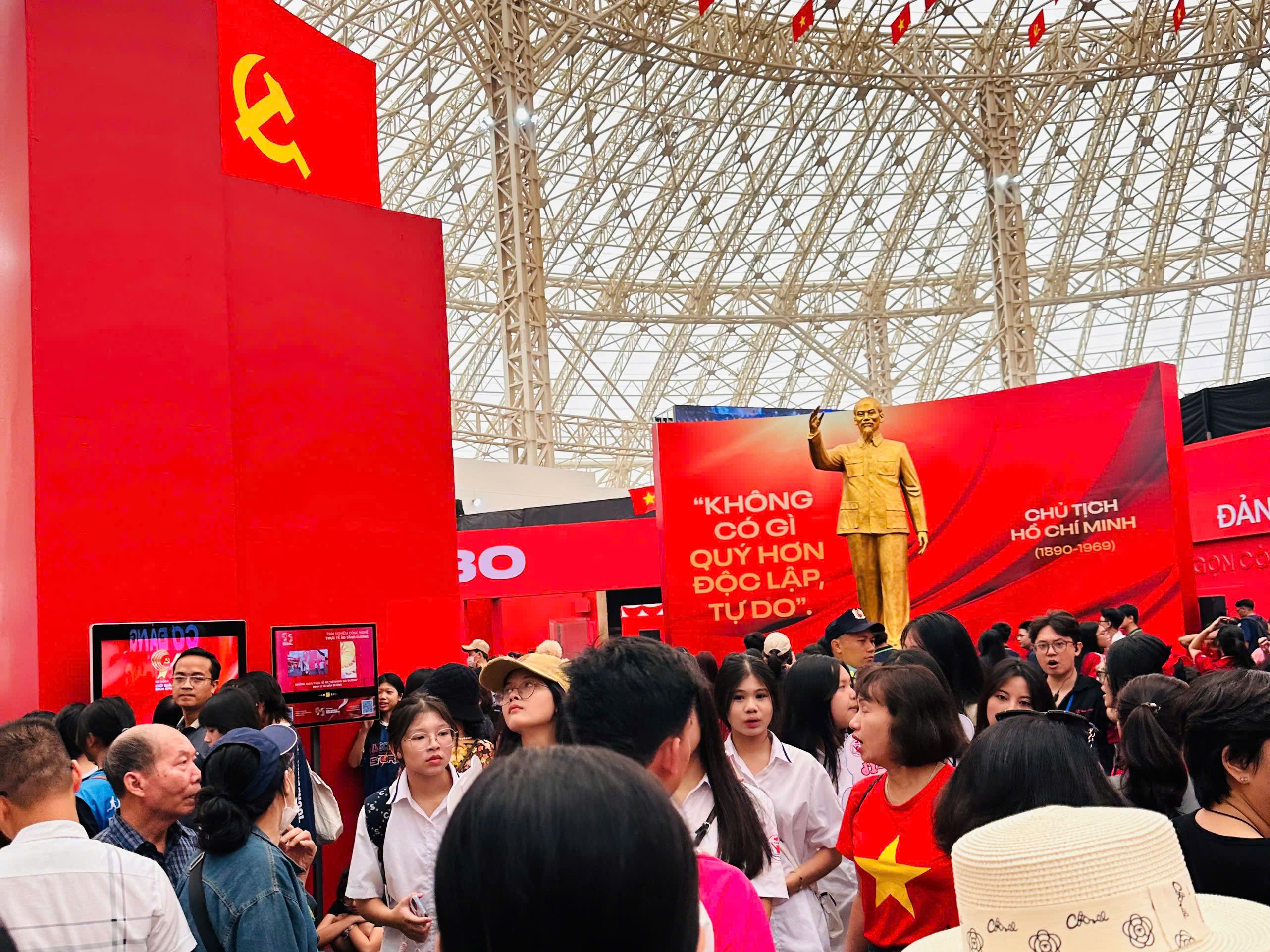 Visitors crowd into the exhibition titled “95 Years of the Party Flag Lighting the Way” hosted by Nhan Dan Newspaper.