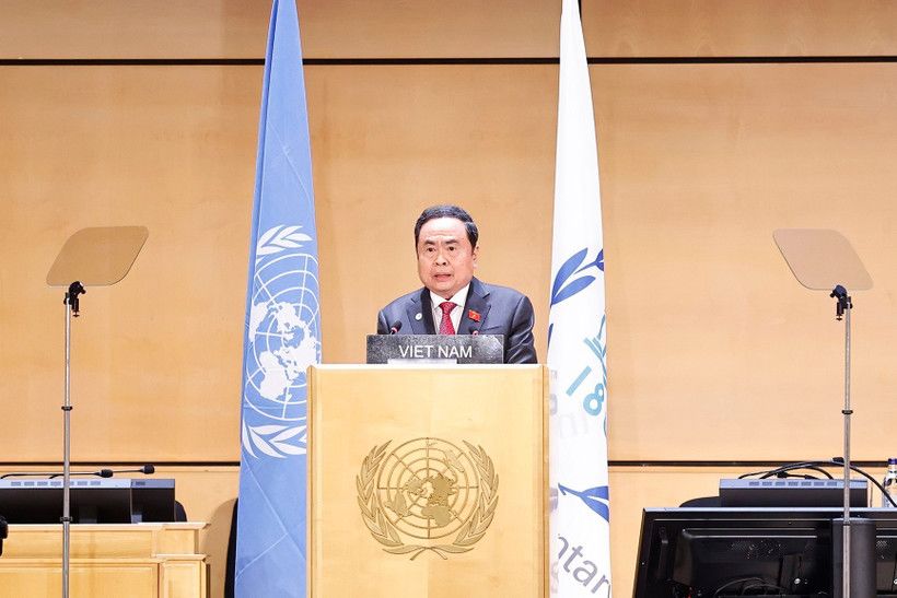 National Assembly Chairman Tran Thanh Man delivers a speech at the general debate of the 6th World Conference of Speakers of Parliament, on July 29, 2025, in Geneva, Switzerland. (Photo: VNA)