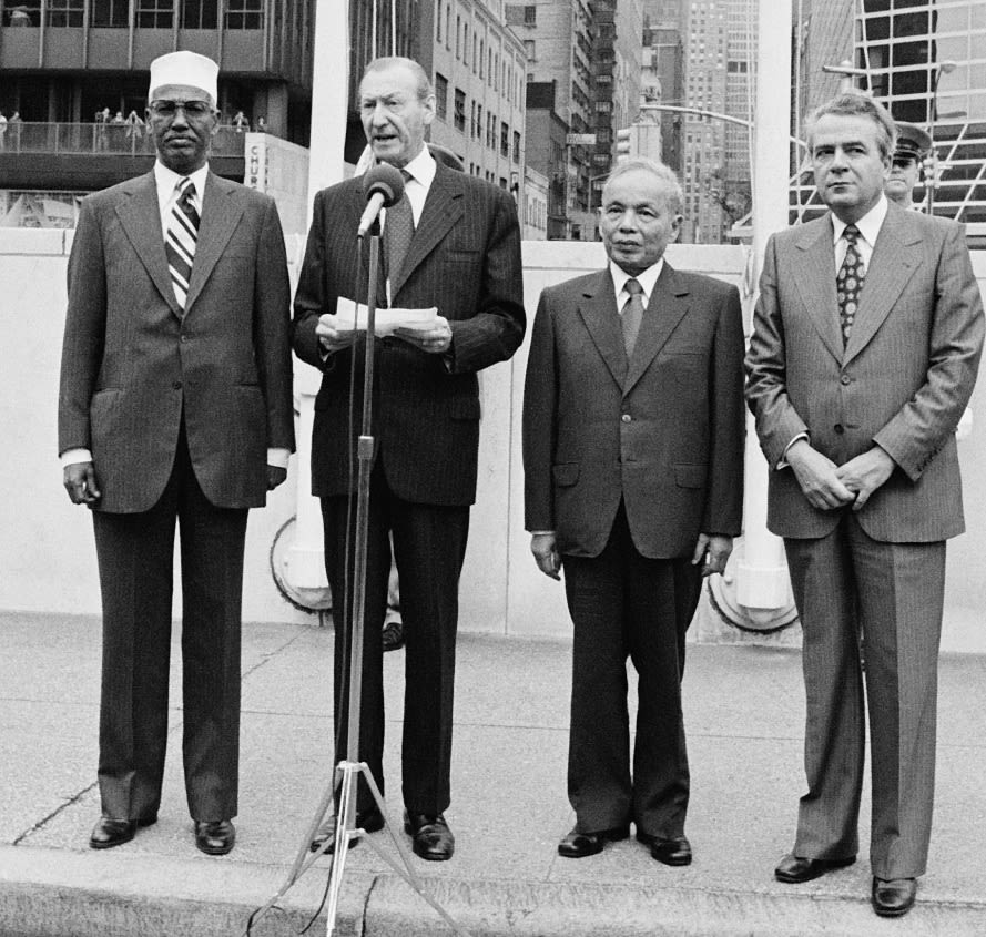 On September 20, 1977, Viet Nam became an official member of the United Nations. In the photo: Deputy Prime Minister and Foreign Minister Nguyen Duy Trinh (second from right) attended the Viet Nam flag-raising ceremony at the UN Headquarters. (Photo: UN.ORG)